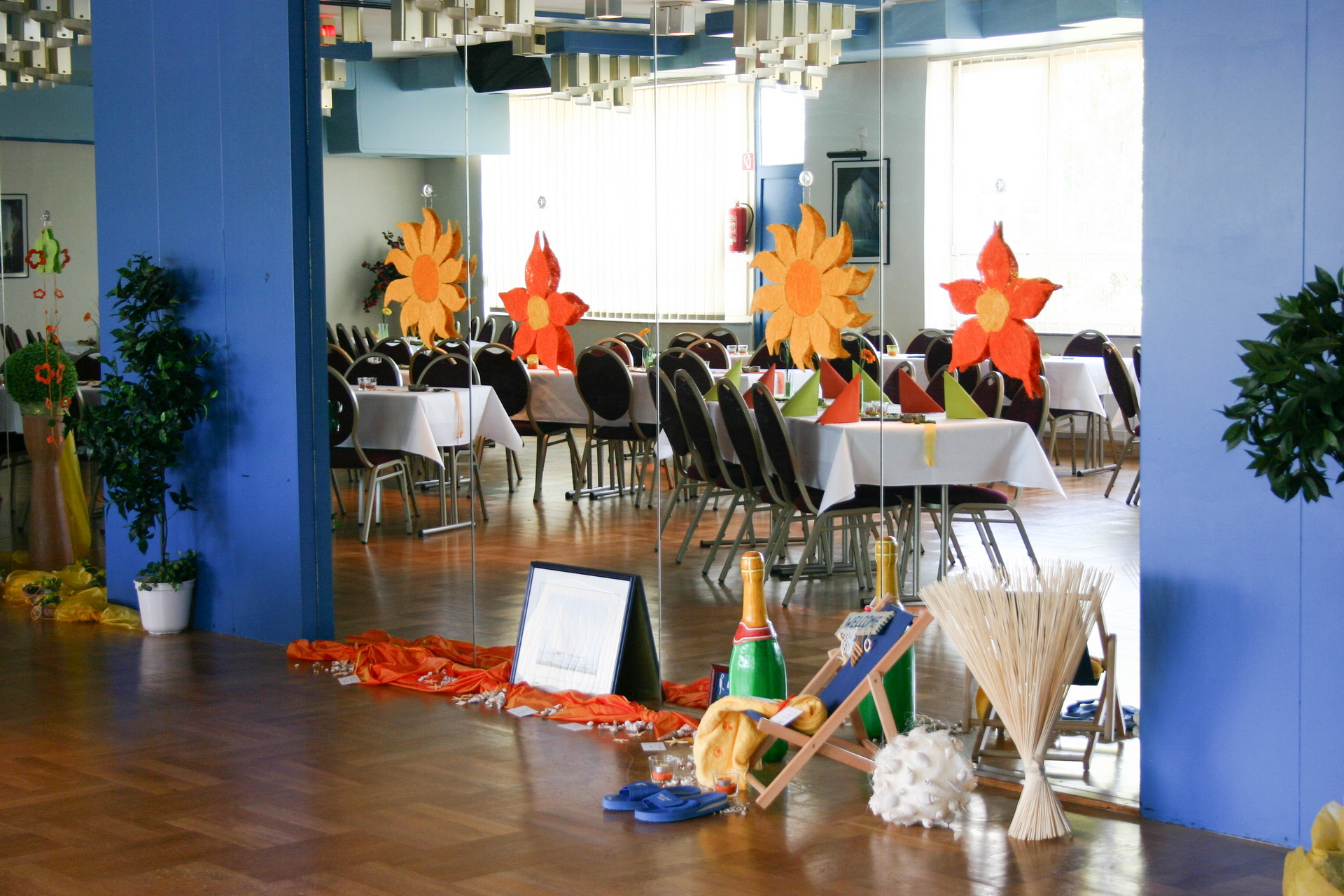 In unserer Vorbesprechung für Ihre Feier haben wir mit Ihnen den passenden Tischplan für Ihre Veranstaltung besprochen. Am Tag Ihrer Veranstaltung stellen wir den Saal so, wie wir es vereinbart haben. Die Tische sind variabel zusammenzustellen. Jeder Tisch ist 1,20 m x 0,80 m groß und wird von uns mit einer weißen Stofftischdecke eingedeckt. Auf Wunsch stellen wir Ihnen auch gerne runde Tische zur Verfügung. Die runden Tische haben einen Durchmesser von 1,60 m. Es können max. 10 Personen an den runden Tischen sitzen. Die weitere Dekoration können Sie gerne selber übernehmen.