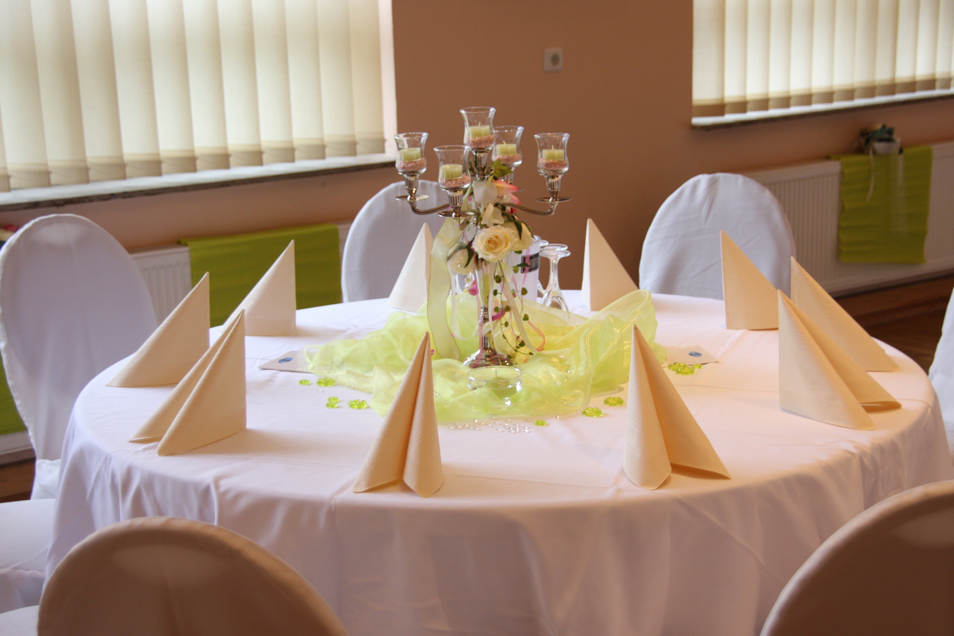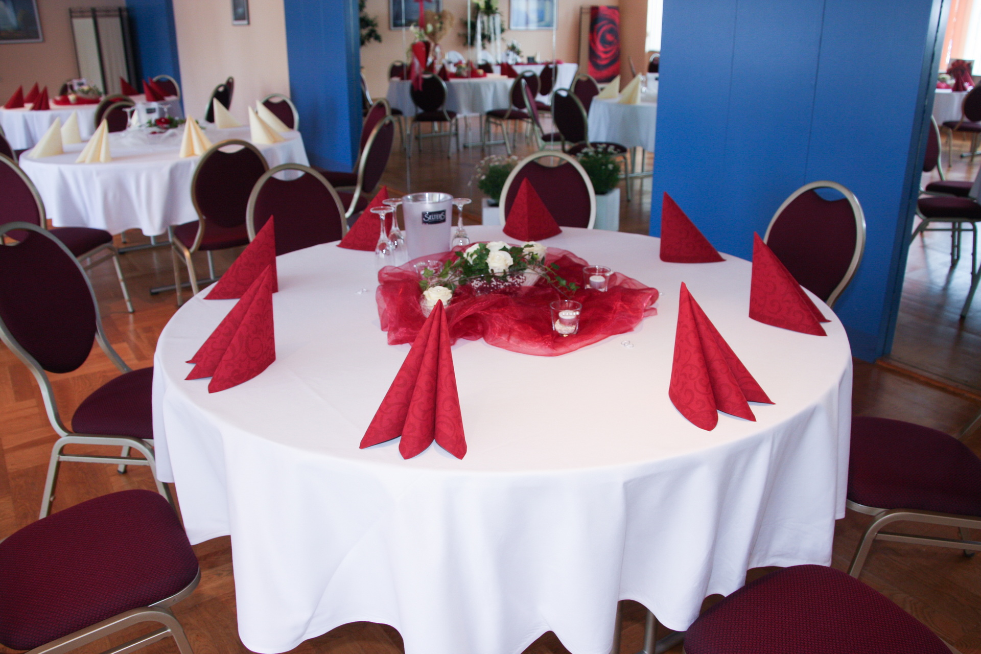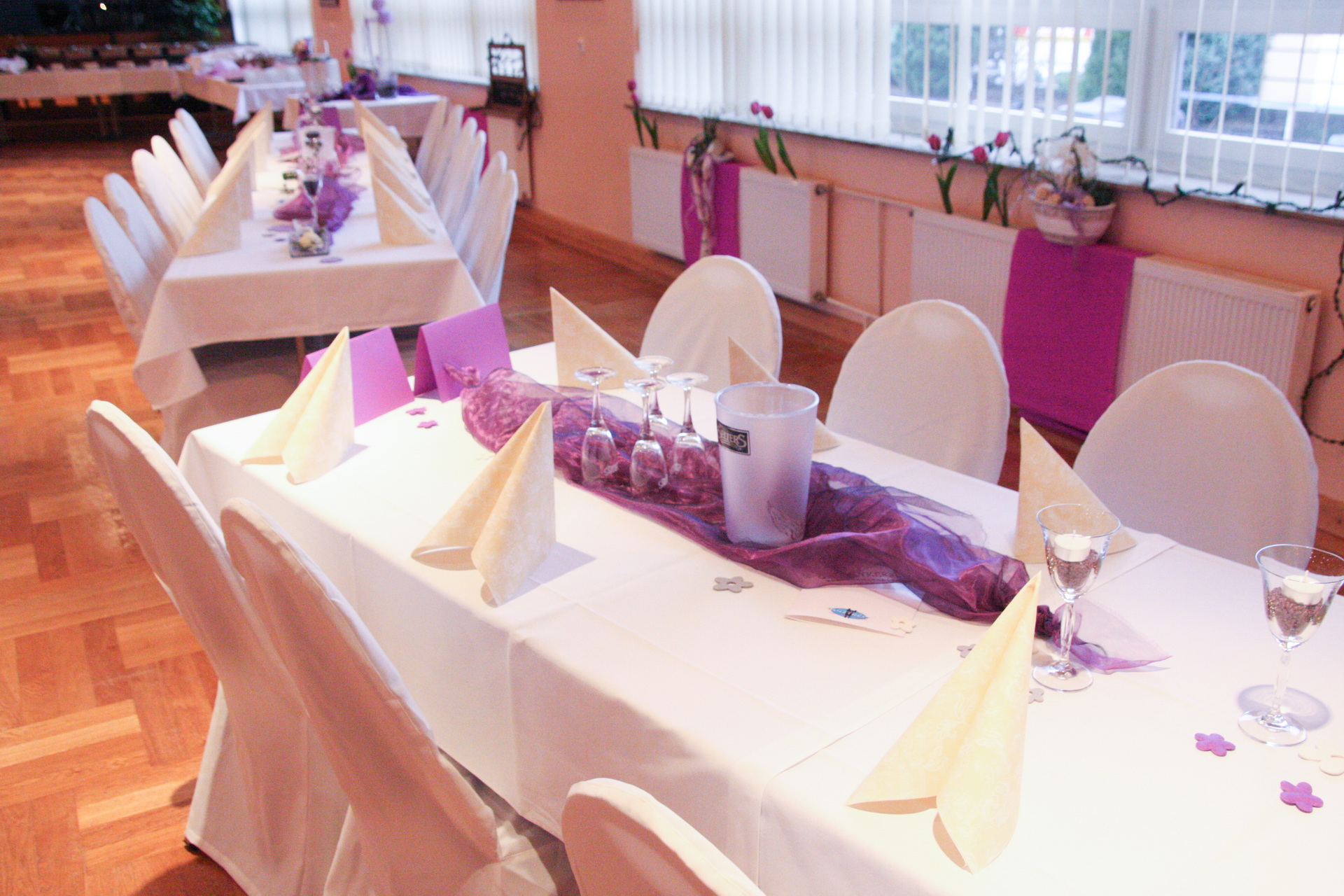 In unserer Vorbesprechung für Ihre Feier haben wir mit Ihnen den passenden Tischplan für Ihre Veranstaltung besprochen. Am Tag Ihrer Veranstaltung stellen wir den Saal so, wie wir es vereinbart haben. Die Tische sind variabel zusammenzustellen. Jeder Tisch ist 1,20 m x 0,80 m groß und wird von uns mit einer weißen Stofftischdecke eingedeckt. Auf Wunsch stellen wir Ihnen auch gerne runde Tische zur Verfügung. Die runden Tische haben einen Durchmesser von 1,60 m. Es können max. 10 Personen an den runden Tischen sitzen. Die weitere Dekoration können Sie gerne selber übernehmen.