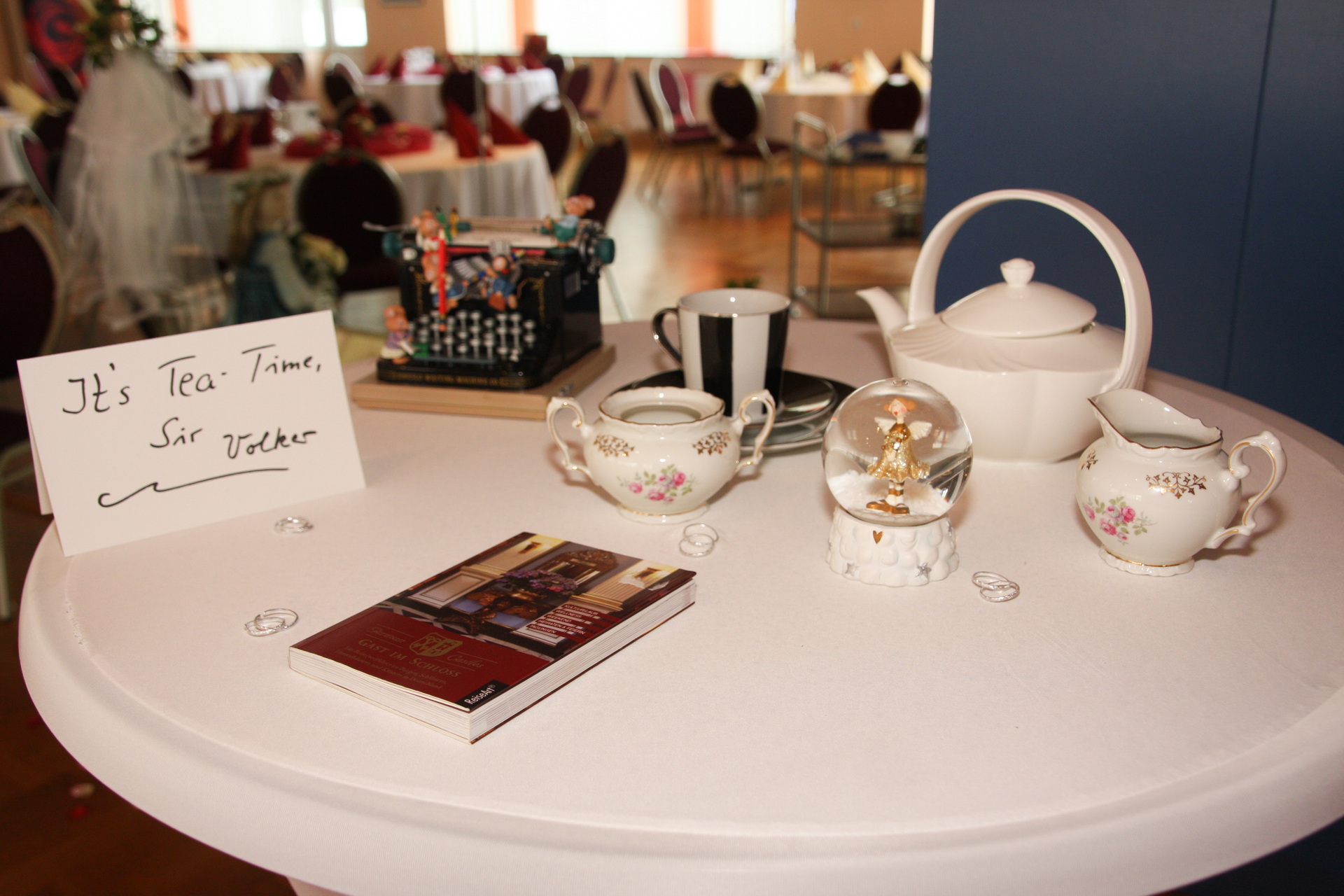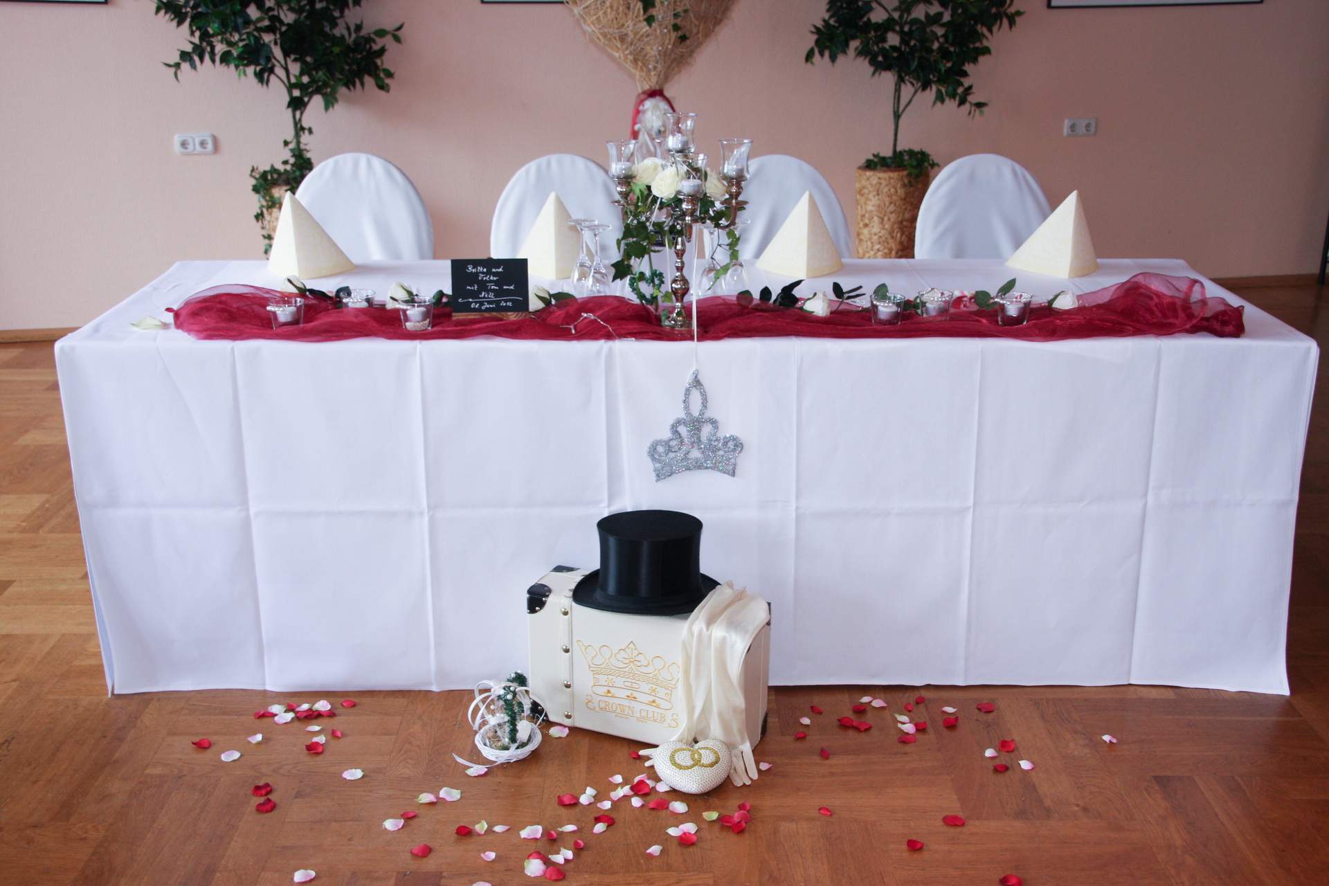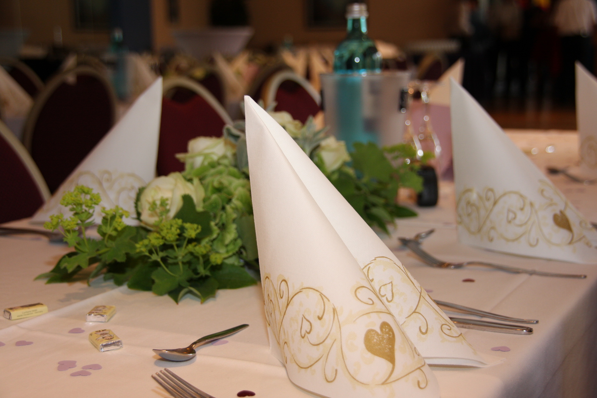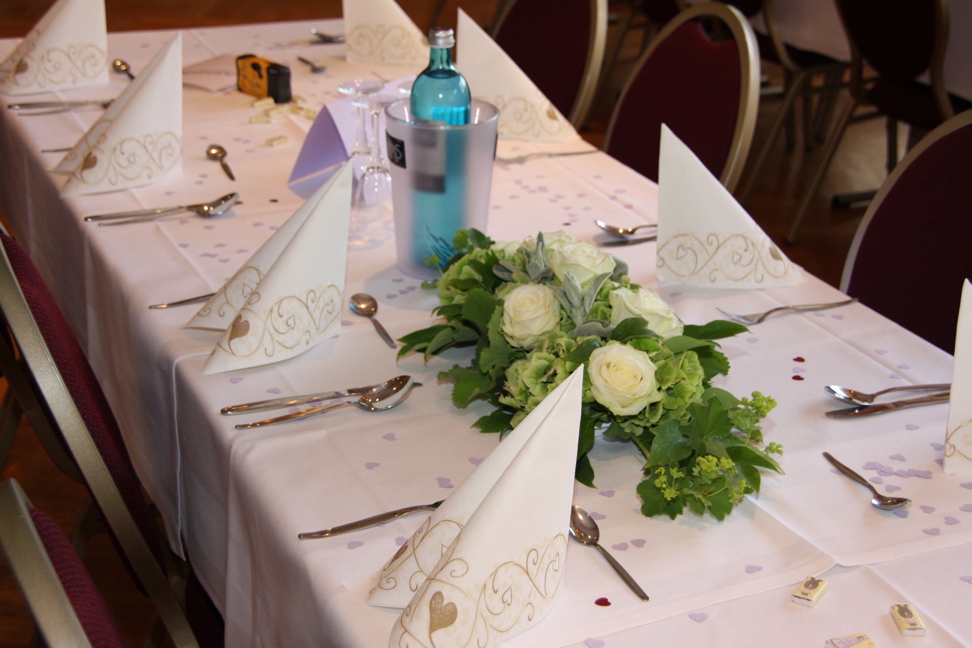 In unserer Vorbesprechung für Ihre Feier haben wir mit Ihnen den passenden Tischplan für Ihre Veranstaltung besprochen. Am Tag Ihrer Veranstaltung stellen wir den Saal so, wie wir es vereinbart haben. Die Tische sind variabel zusammenzustellen. Jeder Tisch ist 1,20 m x 0,80 m groß und wird von uns mit einer weißen Stofftischdecke eingedeckt. Auf Wunsch stellen wir Ihnen auch gerne runde Tische zur Verfügung. Die runden Tische haben einen Durchmesser von 1,60 m. Es können max. 10 Personen an den runden Tischen sitzen. Die weitere Dekoration können Sie gerne selber übernehmen.
